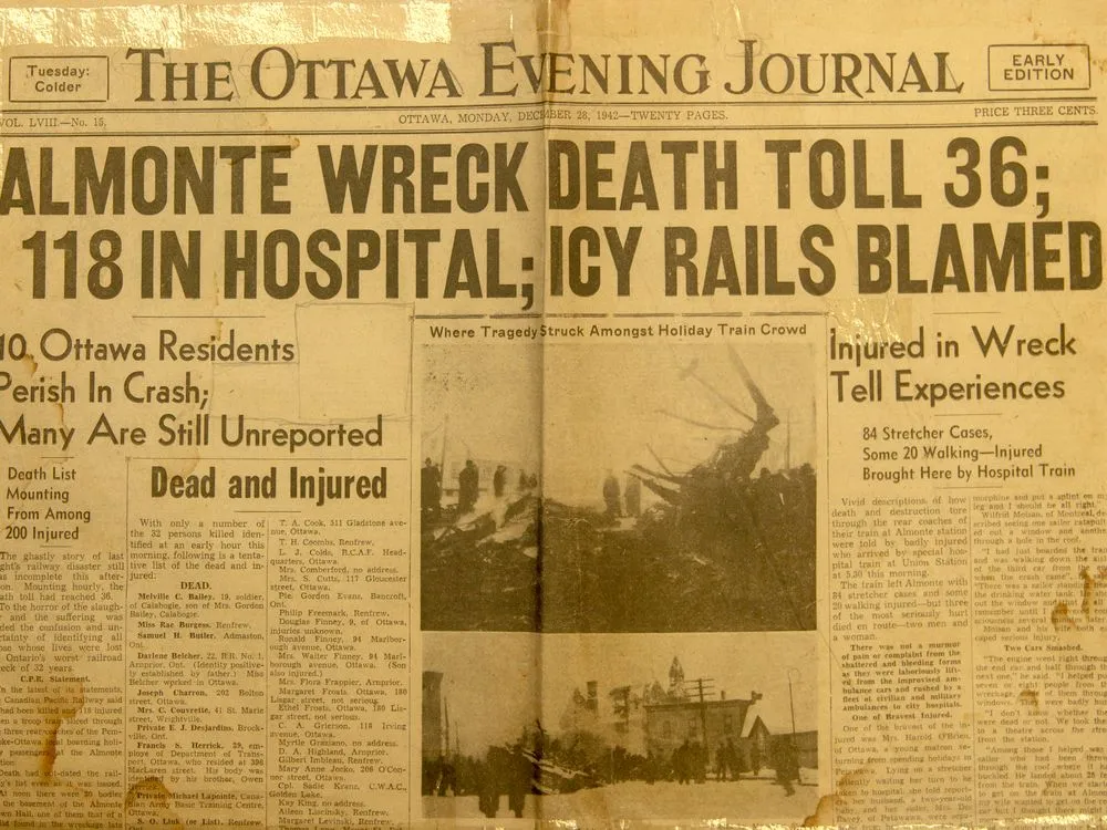 A song composed by Mac Beattie about the terrible train collision that occurred in Almonte on December 27, 1942. It appears on his 1965 lp "This Ottawa Valley of Mine". Mac Beattie (1916-1982) was a songwriter and bandleader from Arnprior, Ontario. His band "Mac Beattie & the Ottawa Valley Melodiers" included fiddler Reg Hill. Mac was the drummer. In his youth he was a celebrated goalie on local hockey teams. There are lots of other Mac Beattie songs available on YouTube.