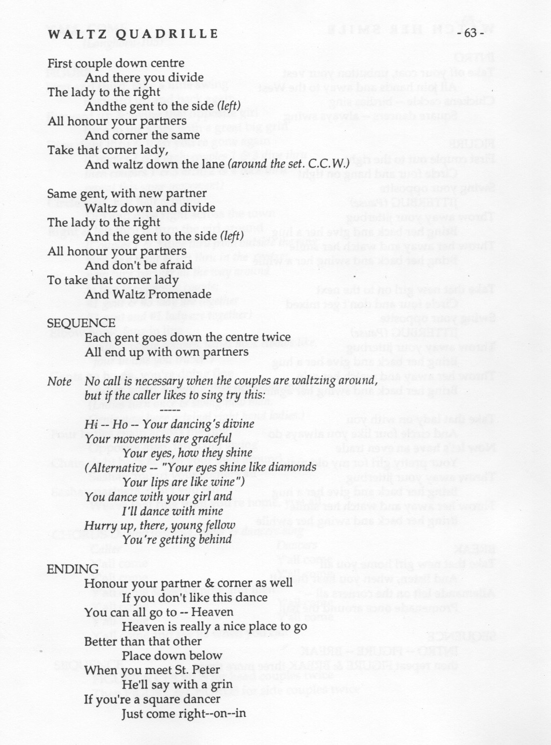 A called waltz group dance, also sometimes called "Waltz Promenade". This dance is still done (in 2025) by some old-time square dancers in Ontario. Recording by George Wade and His Cornhuskers.